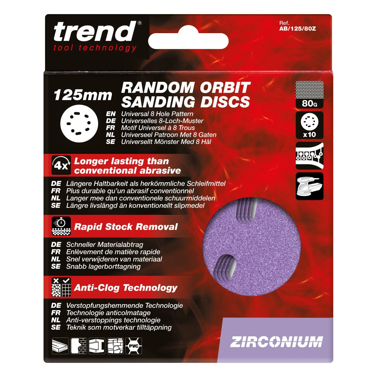 High performance multi-material long life Zirconium abrasive for 125mm Diameter Random Orbit Sanders. Suitable for wood, paint, plaster and metal