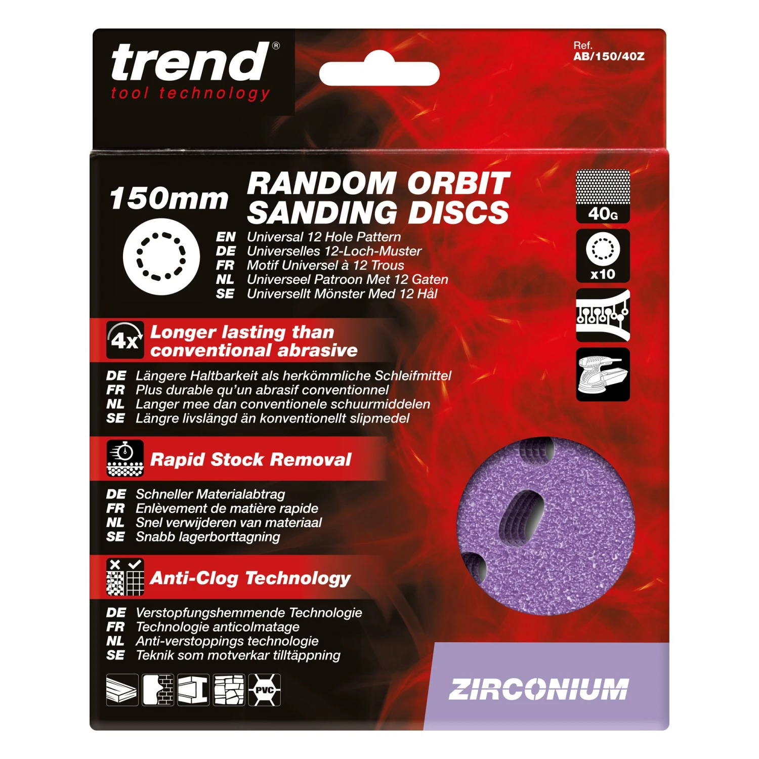 High performance multi-material long life Zirconium abrasive for 150mm Diameter Random Orbit Sanders. Suitable for wood, paint, plaster and metal